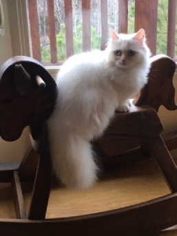 Bing is an adorable long hair short Minuet who loves being a mom. She begs for treats and is my husband’s companion. She is inquisitive and highly intelligent, and has shown that she can plan strategies to problem solve. One must always be on their toes around her, and she is a constant source of entertainment. Bing has a permanent home here because she is my husband’s heart cat.